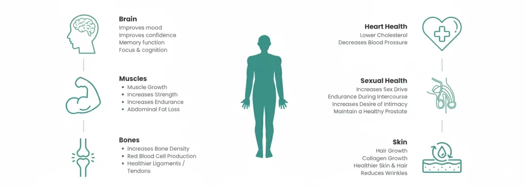Testosterone is the primary male sex hormone and is first detected in males at eight weeks after conception. It plays a vital role in the development of male sexual characteristics such as testicles, prostate, muscle mass, bone density, facial hair, libido, and sexual function..